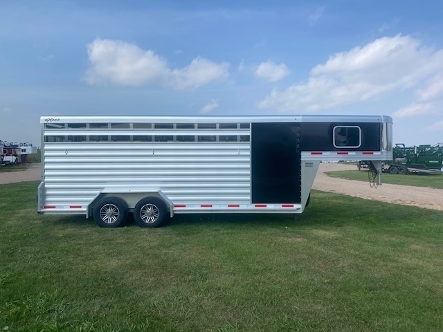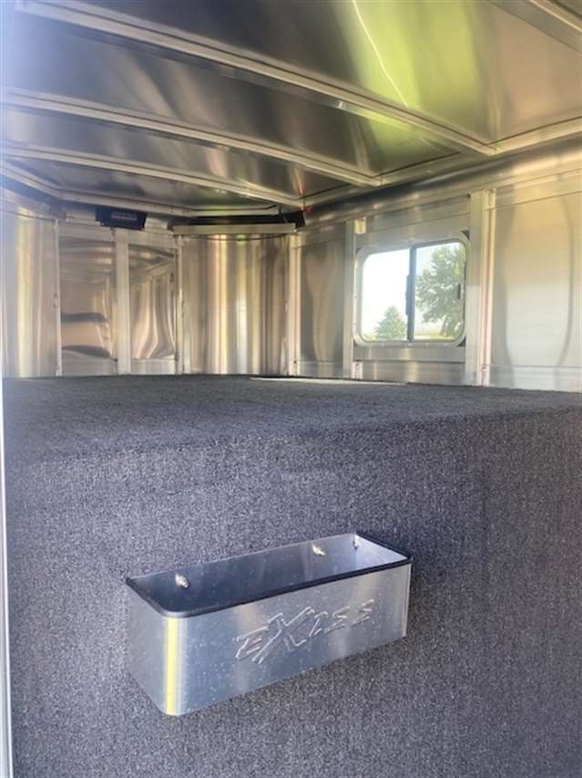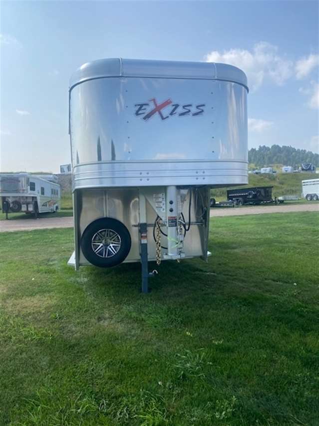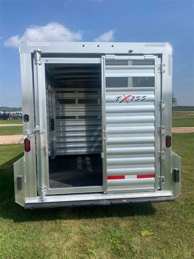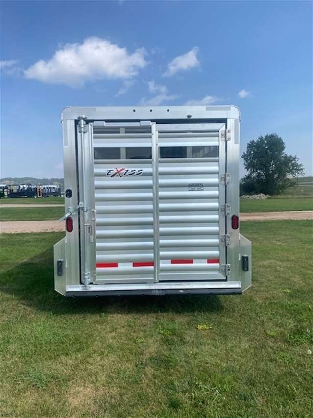 2026 Exiss Stock Combo 7ft wide 7'2" tall and 20ft long. Has 4ft front tack with camper door windows in the nose and 4 tier saddle rack, brush tray, blanket bar and bridle hooks, Stock area is 16ft long with a center divide gate, Easy care flooring and tie hooks inside and outside. Tandem 7K Axles with brakes at all 4 wheels and Aluminum wheels. Black color. 8/3 YEAR LIMITED WARRANTY