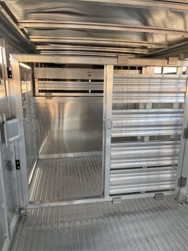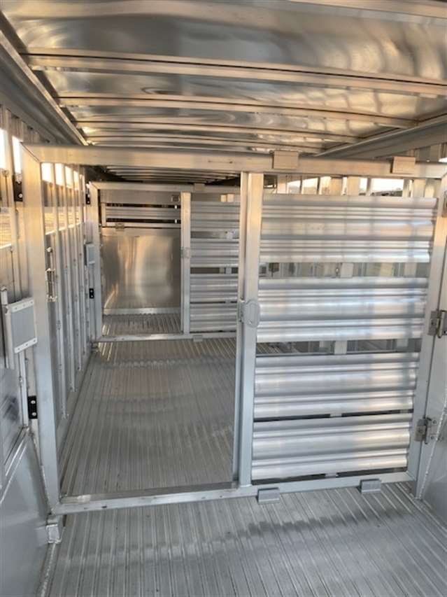 2026 Featherlite 50th Anniversary model 8127 Stock Trailer 7X24, Two center divide gates with first gate back 5'8" from front and second gate dividing the remainder of the stock compartment all gates have sliders and slam latches, 54" side 4wheeler/Escape door, 4 outside tie rings on rear frame to hook panels to, Tandem 7K torsion axles with brakes at all wheels, Western Package, Black Nose skin. 10 YEAR LIMITED WARRAQNTY