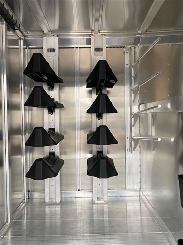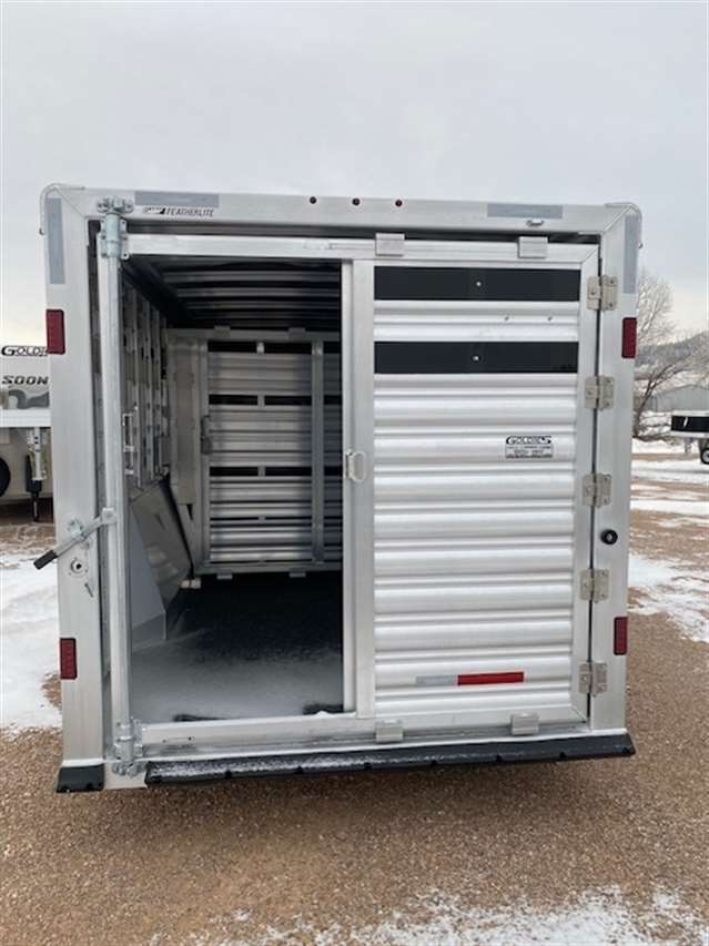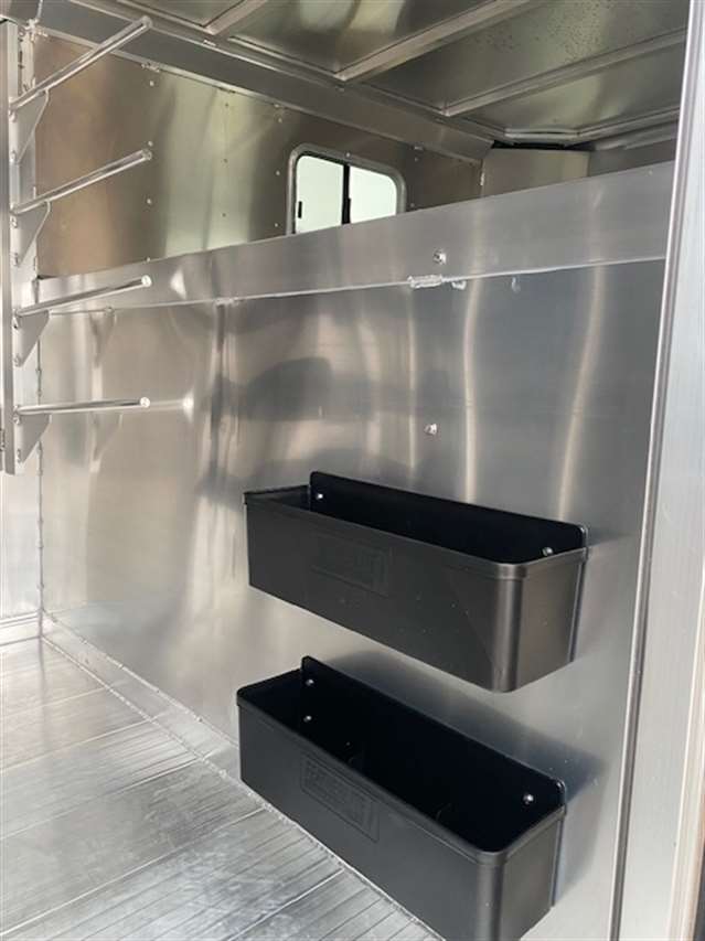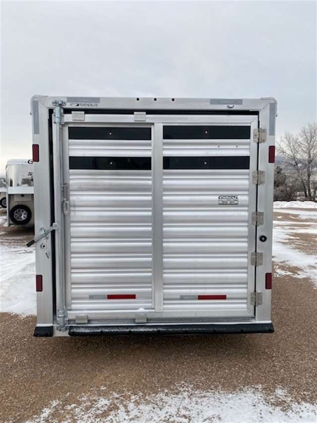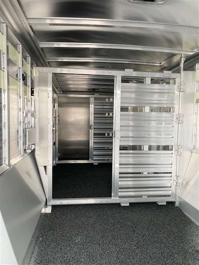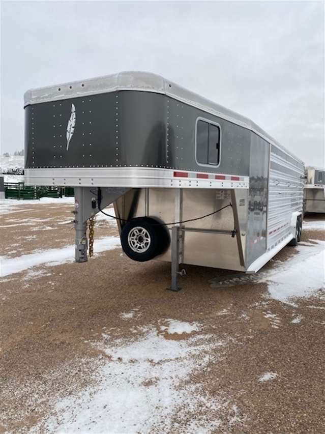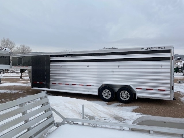 2025 Featherlite Model 8413 Stock Combo 7.6 Wide, 26ft long and 7ft high, Has 5ft front tack with 8 saddle racks, lots of bridal hooks, blanket bar and brush tray, Smoked plexiglass inserts, 2 Center cut gates with sliders and slam latches, 1st gate is 4ft back from the tack wall works as a stud gate or for feed 2nd gate is centered in the rest of stock area making to 8.5ft compartments, Easy Care flooring, Pop up roof vents, Tandem 8K axles with electric brakes and Silver Aluminum wheels. Charcoal skin. 10 YEAR LIMITED WARRANTY