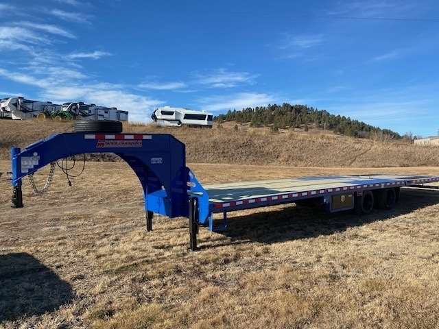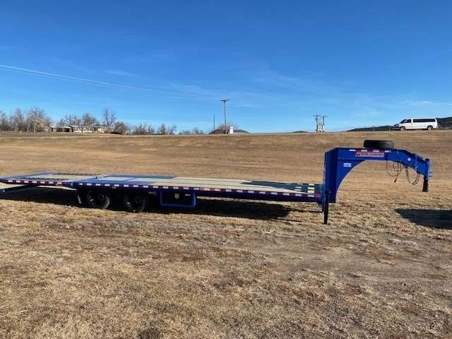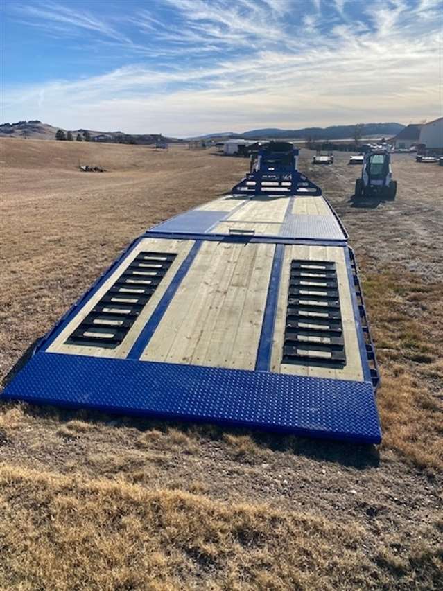 2024 Midsota 102" wide and 34' Long Deck over flat bed with 10' Hydraulic beaver tail with Traction strips, Has 12K Hutch axle upgrade with 17.5 Steel wheels and 16ply tires including spare rim and tire, 25900lb GVWR, Hydraulic jacks, Tool box under body and one under gooseneck Winch Ready, Pulse Tech 7-watt solar charger, Wireless remote, Paint color Blue, 5-Year Limited Warranty