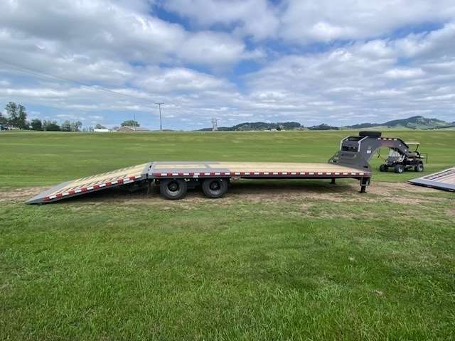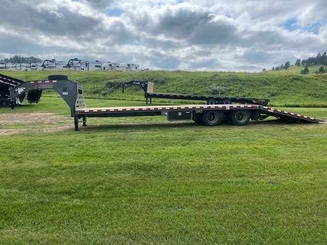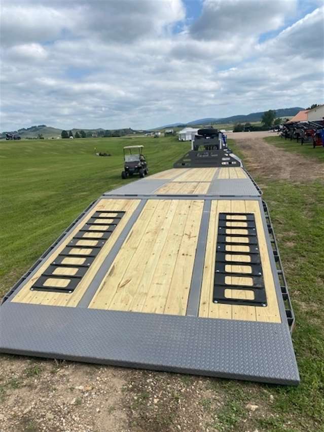2025 Midsota 102" wide and 32' Long Deck over flat bed with 10' Hydraulic beaver tail with Traction strips, Has 12K Hutch axle upgrade with 17.5 Steel wheels and 16ply tires including spare rim and tire, 25900lb GVWR, Hydraulic jacks, Tool box under body and one under gooseneck Winch Ready, Pulse Tech 7-watt solar charger, Wireless remote, Paint color Gray, 5-Year Limited Warranty