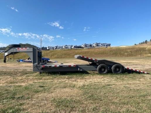 2024 Midsota TBWB26 Gooseneck Wide body Tilt Bed, 102" wide and 26ft long has a 8ft stationary deck and a 18ft locking tilt bed, Tandem 10K torsion axles with 17.5 Steel wheels and 18ply tires for a GVWR of 23,000lbs, Spare tire and Tool box under gooseneck, Pallet Fork Holders, Traction Strips,. Color Gray. 5 YEAR LIMITED WARRANTY