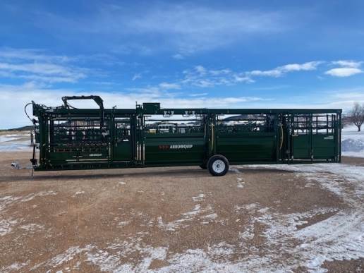 2025Arrowquip Model 10818L-EF8 Portable Hydraulic chute 18ft adjustable alley way and budflow tub. Hydraulic jacks, Chute is the new 108 Series that you can operate from either side and has the neck extenders, sternum bar and vet cage, 18ft of adjustable easy flow alleys with a rolling door in the center and another just before the 8ft budflow tub.