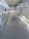 2024 Sooner 7.6 wide 28ft long with 2 center divide gates with sliders first gate is 6ft back from drop wall and second gat is centered in the remaining stock area making two 12ft compartments slam latches on all gates, 54 inch wide side 4wheeler/escape door, Tandem 8000lb torsion axles with 17.5 steel wheels and 16ply tires with brakes at all 4 wheels, drop covered vents under gooseneck 3/8 YEAR WARRANTY
