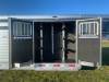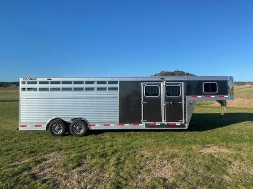 2024 Sooner Model SRD 8024 Smart Tack, 7'2" Tall 8' wide 24ft long, Has Smart Tack Side tack with 2 tier 6 place saddle rack, Blanket bar and lots of bridle hooks, 6ft short wall dressing room with boot box, Camper steps for tack room and side tack, Horse area has easy care flooring front stud stall and the new air flow padded dividers, Tie rail inside and outside, 2-way roof vents above each horse and Smoked plexiglass side inserts, Hydraulic jack and tandem 7K torsion axles with Aluminum wheels, Metallic black side sheets, 8YEAR LIMITED WARRANTY