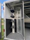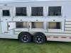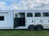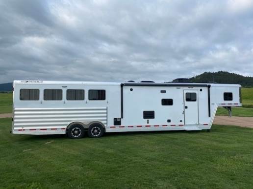 2025 Featherlite Model 9808 4 Horse L.Q. 8ft wide 7'6" Tall 32'3" Long with a 13ft Short wall Liberty SE Living Quarters, Slide out, Interior Decor Package Urban Saddle, 40 Gallon Fresh Water Tank, Two 31 Gallon holding tanks, Ducted ceiling 13,500 BTU Air Conditioning, 20,000 BTU Ducted Furnace, Jacknife sofa and Dinette, 1.9 Cubic foot stainless steel convection microwave, 8 Cu ft Refrigerator with freezer, On demand pressure water system with 6 gallon water heater, Solid wood Cabinets, Commercial grade linoleum flooring, Swing out TV, 2 Burner stove, Porcelain foot flush toilet, Large radius shower, Medicine cabinet above sink in Bathroom. Electric Awning. Horse area has easy care flooring, Air flow stall dividers, Drop down feed doors at head side and bus windows at tail side, Mangers, Rear collapsable tack with 4 tier saddle racks, Dual Hydraulic Jacks. 3/10 YEAR LIMITED WARRANTY