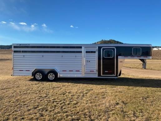 2025 Featherlite Model 8413 Stock Combo 7.6 Wide, 24ft long and 7ft high, Has 4ft front tack with 4 saddle racks, lots of bridal hooks, blanket bar and brush tray, Smoked plexiglass inserts, 1 Center cut gate with slam latch centered in stock area to make two 10ft compartments, Tie rings inside and outside, Easy Care flooring, Tandem 7K axles with electric brakes and Silver Aluminum wheels. Black skin. 10 YEAR LIMITED WARRANT